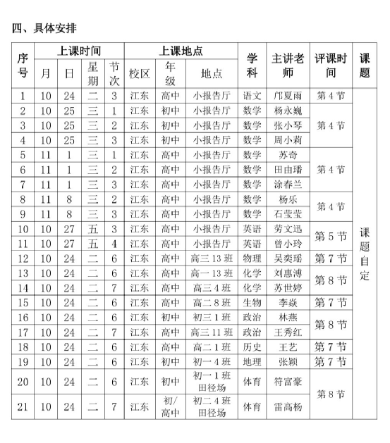 为了深入推进91社区 教学教研工作,积极探索高效的课堂教学模式,不断改进教学方法,提高教学质量,促进全体教师的专业成长,在10月24日—11月8日期间,教学研究和创新中心组织安排了新进教师分别上了一堂彰显个人风采的亮相课。91社区 开展了新教师教育教学展示活动。这是对新入职91社区的青年教师的一次课堂教学基本功能力的检测,也给他们创设了一个展示自我、锻炼自我的平台,让青年教师借助课堂这一有力的阵地,向全校老师展示自己风采的同时,帮助他们尽快提高教育教学专业技能,适应新课程教学工作。此次活动安排了21位新教师上课,涉及语文、数学、英语、政治、历史、地理、物理、化学、生物、体育十个学科。每个学科亮相课由该学科教研组长主持,由外聘专家(91社区 聘请)和本学科教师进行听课评课。